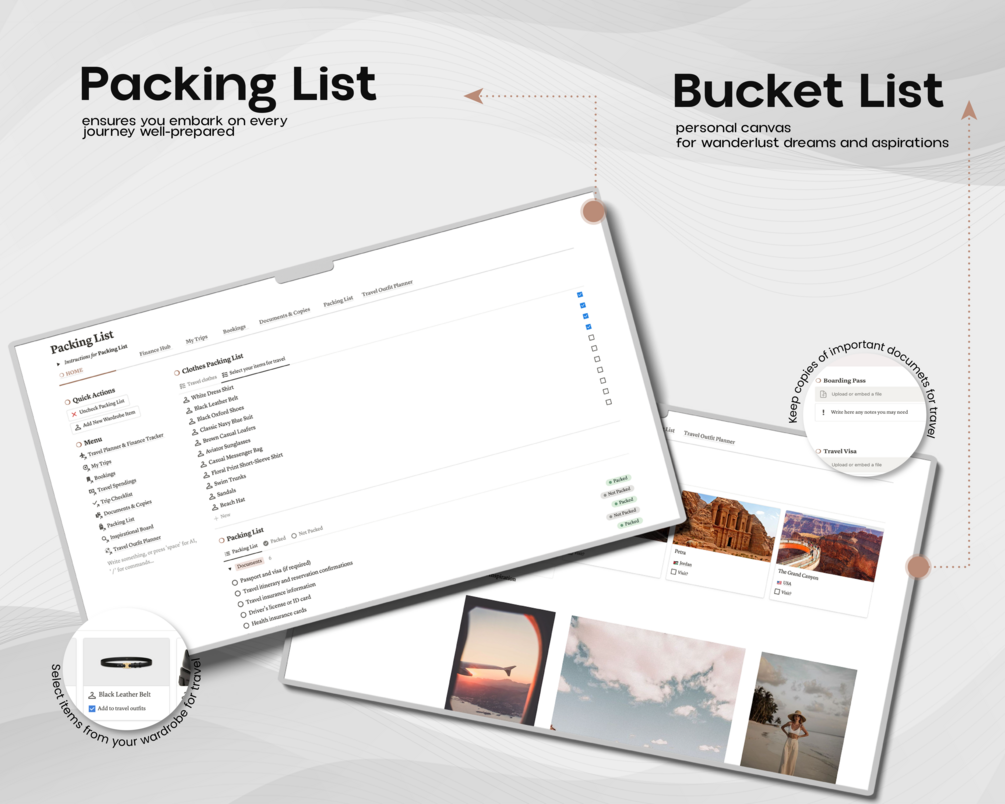 Need some inspiration for your next adventure? Template includes an inspirational board where you can gather ideas and plan your dream trips. Plus, with a travel outfit planner, you can ensure you're stylish and practical on the go.