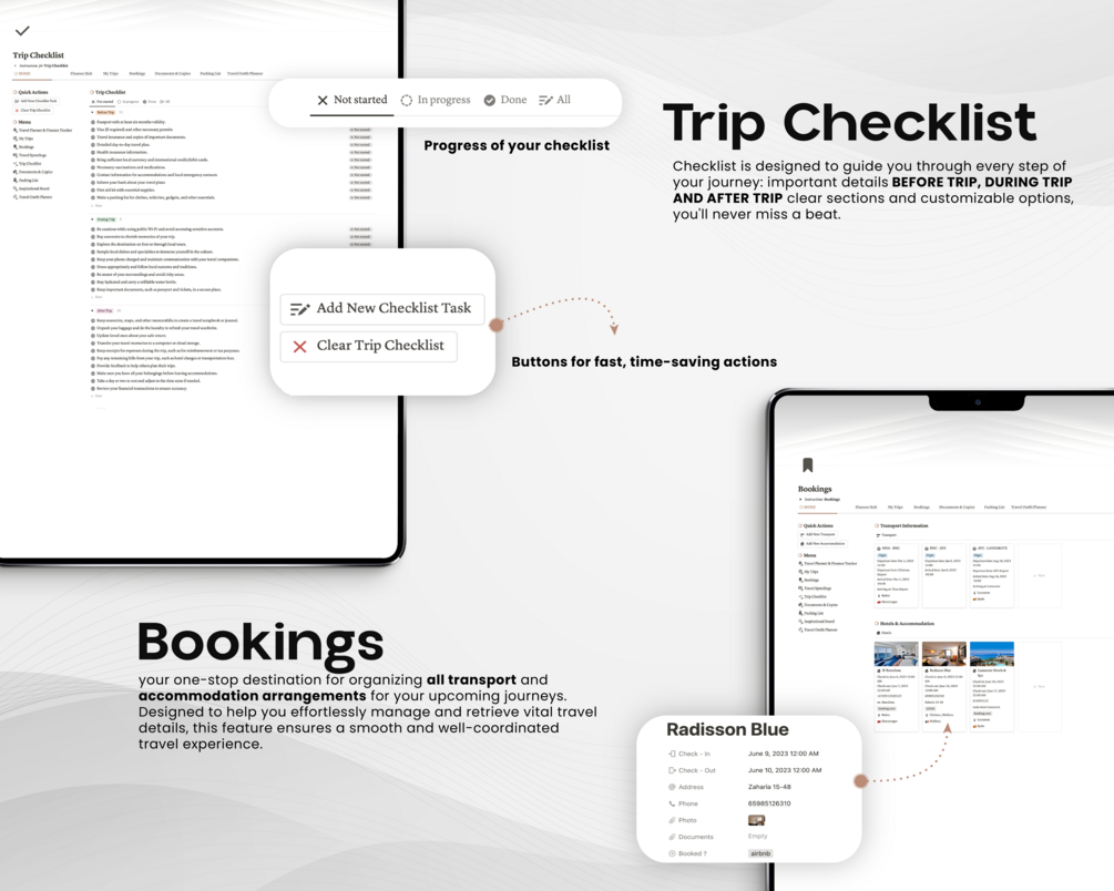 Notion template also features comprehensive checklists for before, during, and after your travels, ensuring you never miss a beat. From packing lists to document storage, we've got you covered.