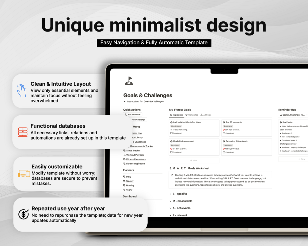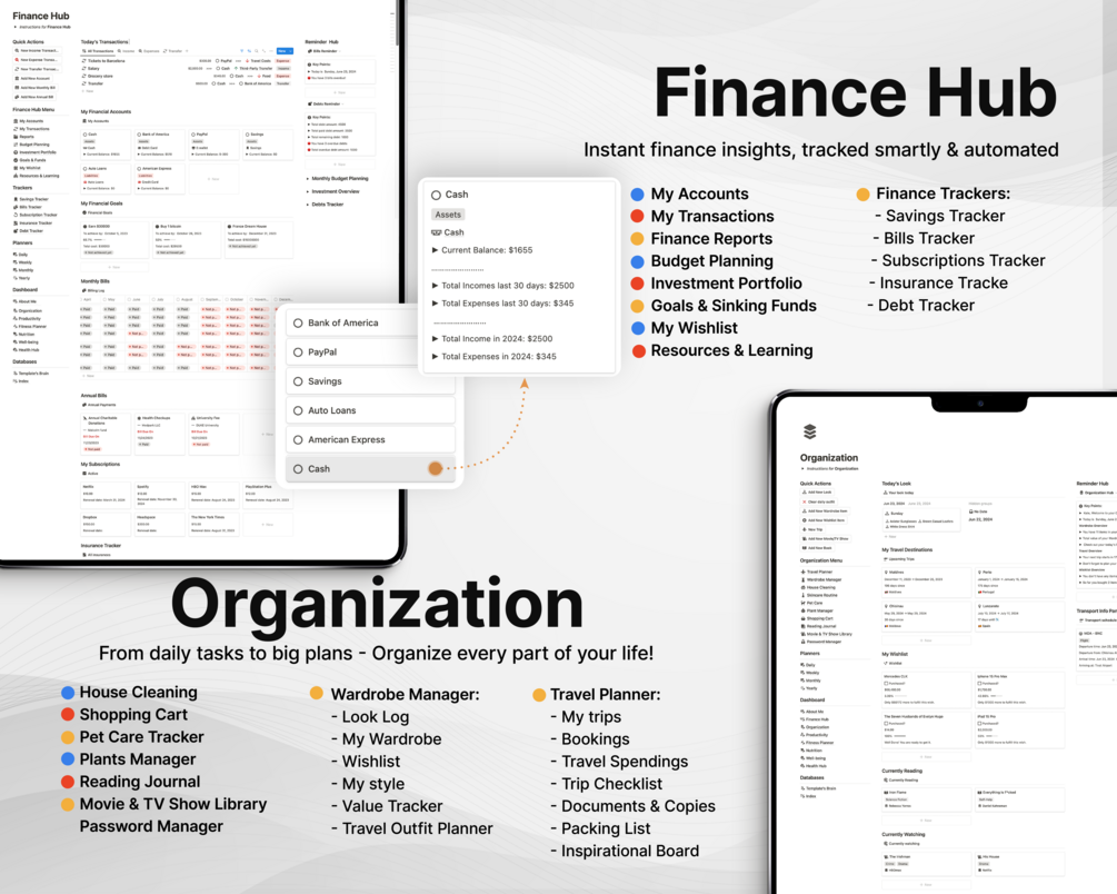 ▪️ Daily to Yearly Planning – All-in-one template for daily, weekly, monthly, and yearly planning, plus dedicated hubs for finance, organization, productivity, fitness, nutrition, well-being, and health.