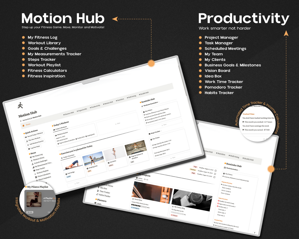 ▪️ Motion Hub – your holistic gateway to physical wellness and fitness within the Second Brain Notion Template. In today's world, where both mental and physical well-being are paramount, the Motion Hub serves as an integrated platform to cater to your fitness aspirations. Whether you're a seasoned athlete or just embarking on your wellness journey, this hub ensures every stride you take is documented, every goal is tracked, and every sweat-drop counts.
