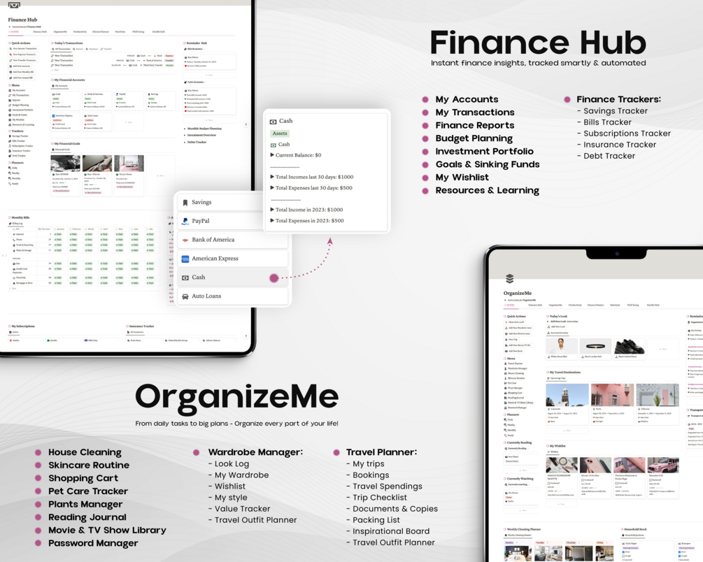 ▪️ Organization Hub: Your ultimate companion for maintaining order and harmony in every sphere of your life. Inside this hub, you'll discover a variety of meticulously designed sections to cater to your diverse needs: Travel Planner, Wardrobe Planner, House Cleaning, Pet Care, Plant Manager, Shopping Cart, Reading Journal, Movie & TV Library, and Password Manager.