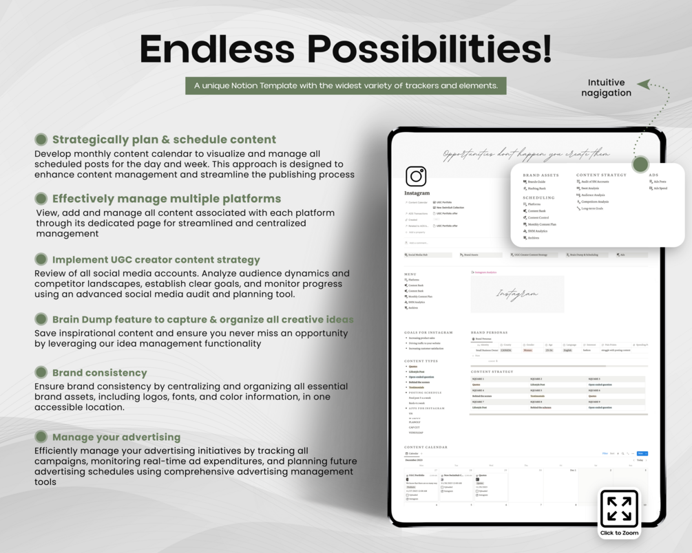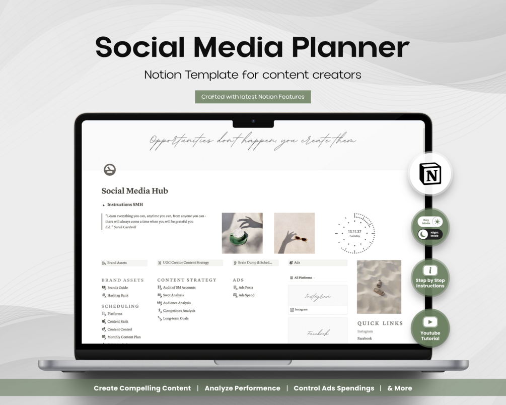 Say goodbye to last-minute content panic! Our Social Media Planner Notion Template empowers you to plan your content in advance, ensuring a consistent and engaging presence across your social media platforms. Effortlessly map out your content calendar, brainstorm ideas, and schedule posts in a visual and intuitive interface. Stay one step ahead and establish a well-curated online presence that captivates your audience.